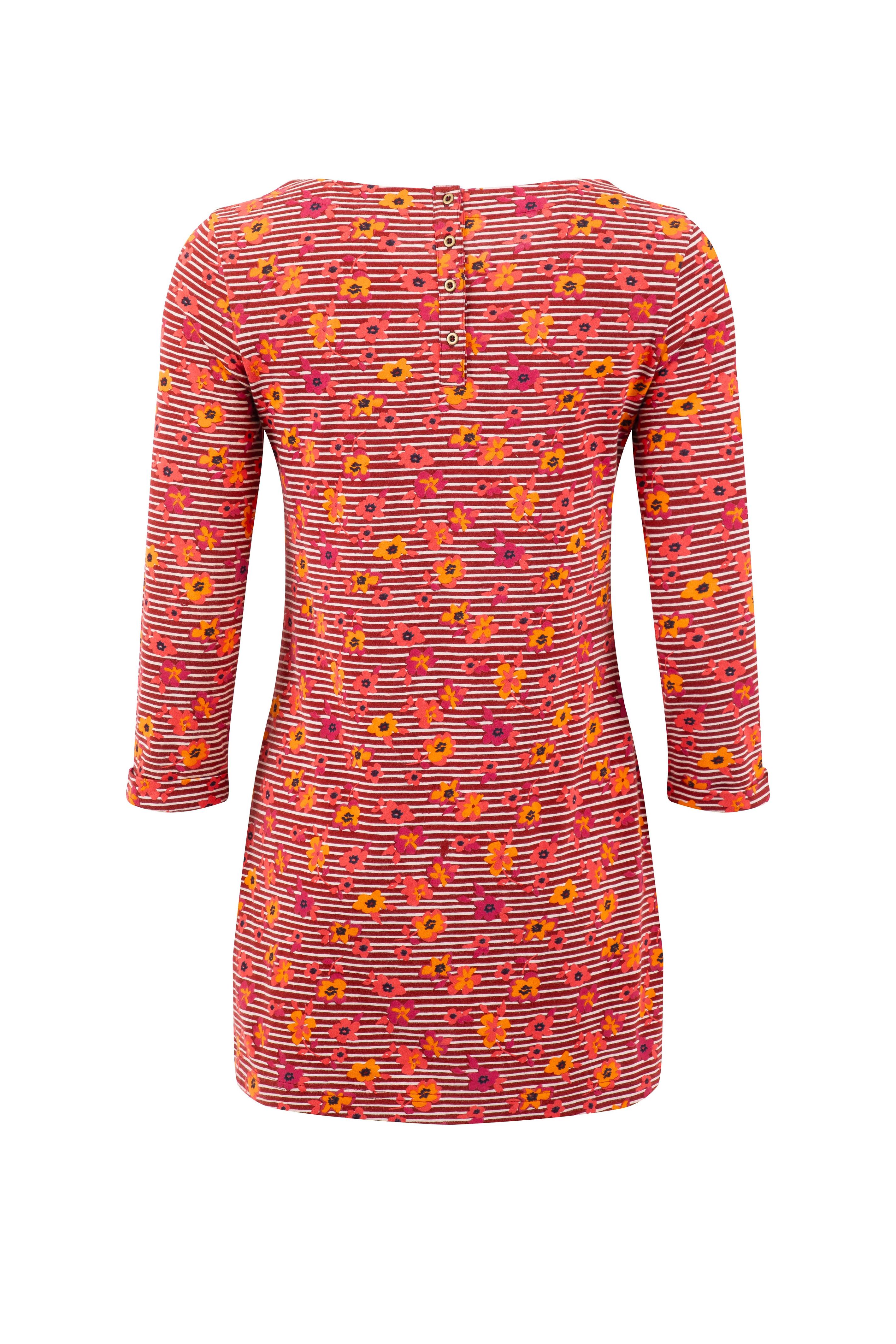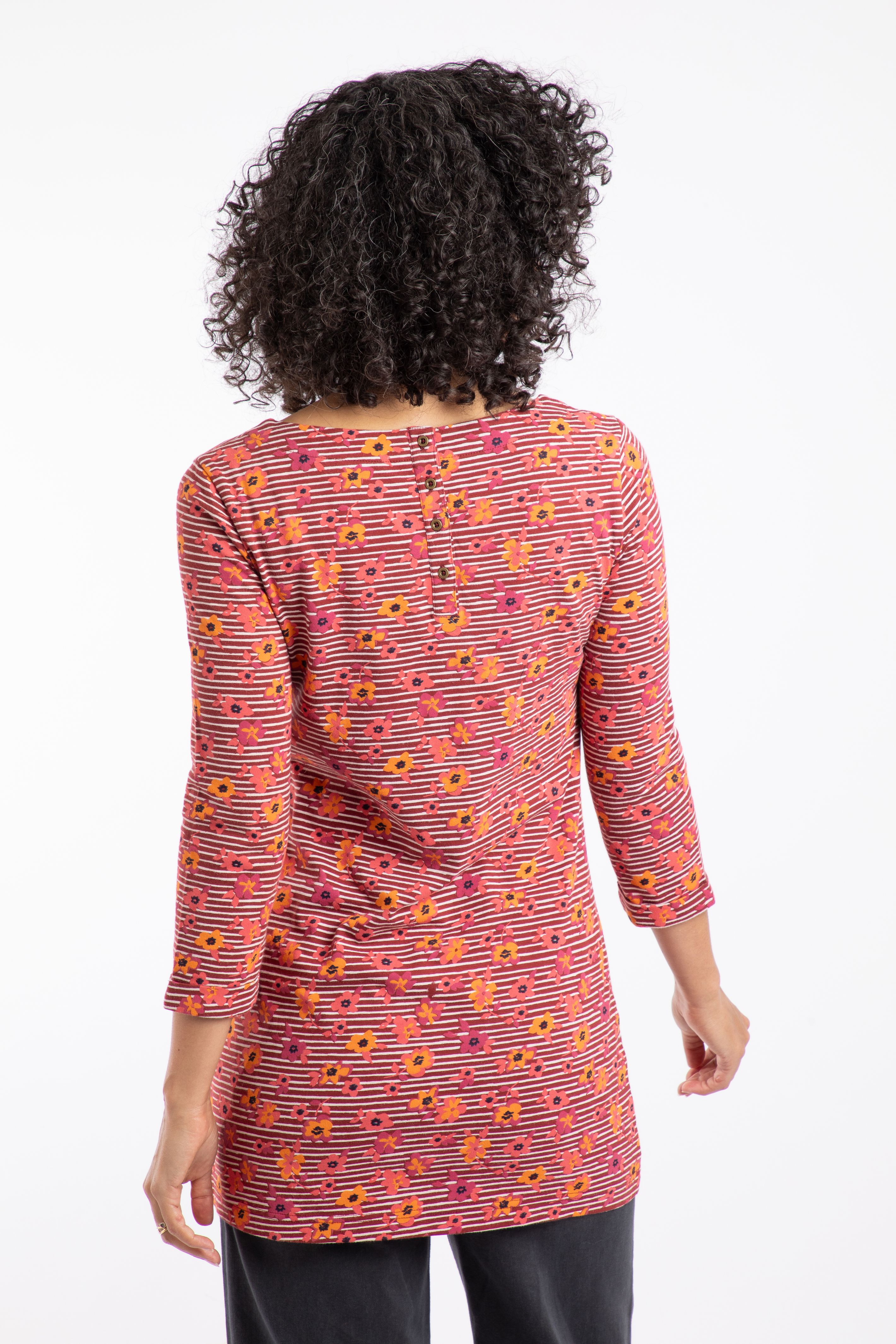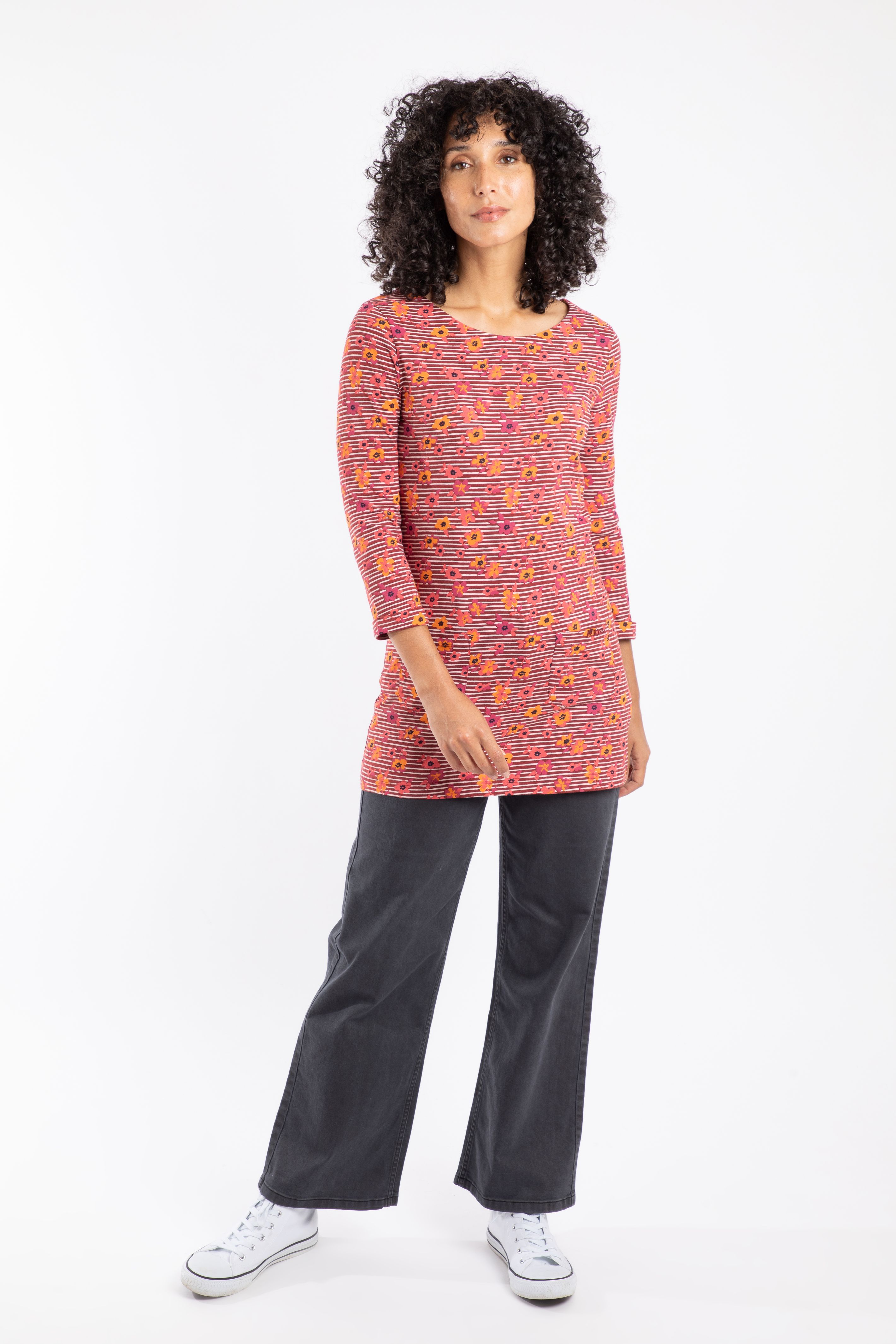 The Charlotte organic cotton printed jersey tunic is a great transitional piece for the season. When the weather still isn't sure if it's Summer, Autumn or even Winter, this longer length tunic with 3/4 sleeves is light enough for a warm day, but gives enough coverage for a cold snap, especially when layered over jeans and with a jacket or cardigan.