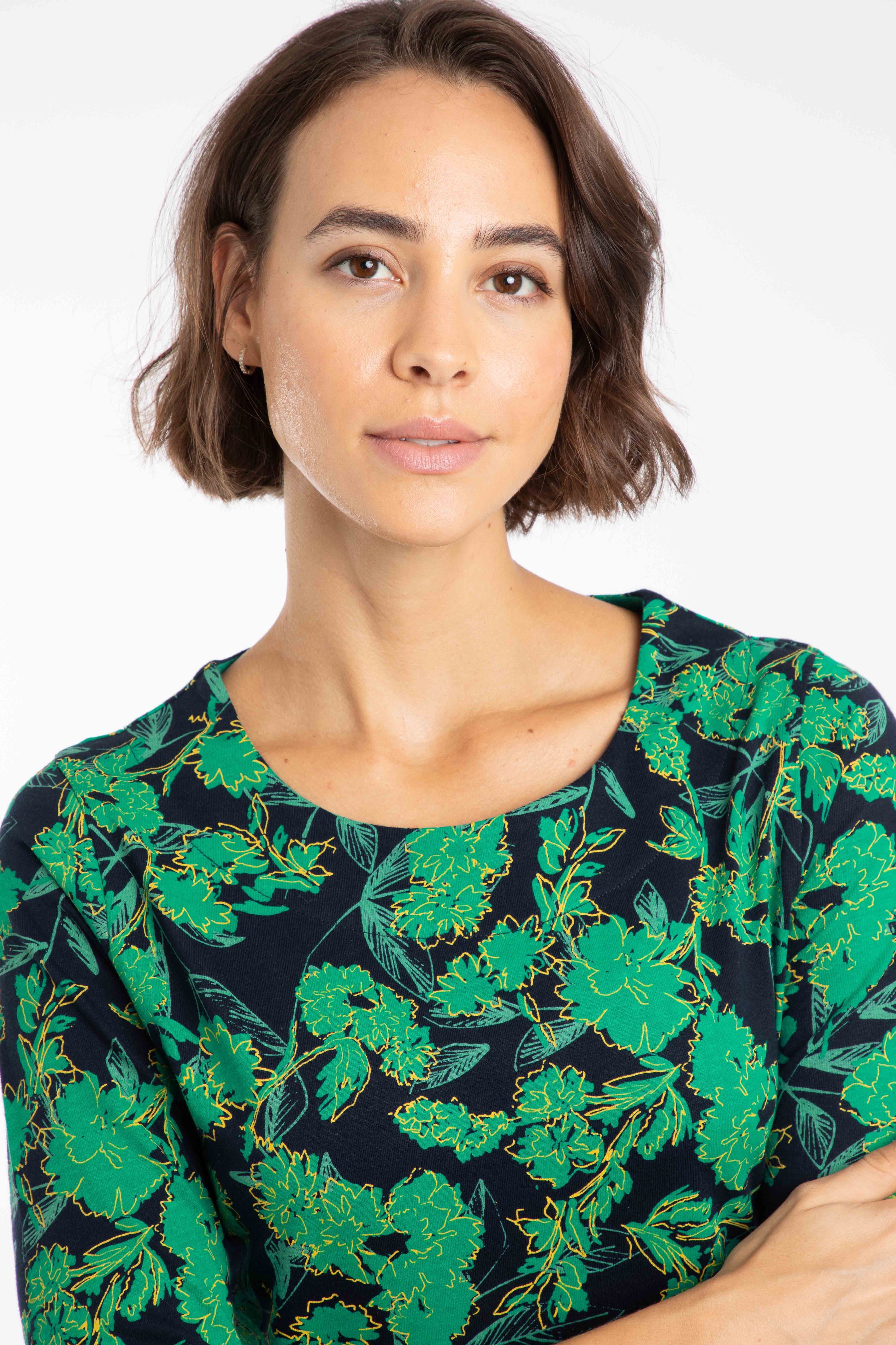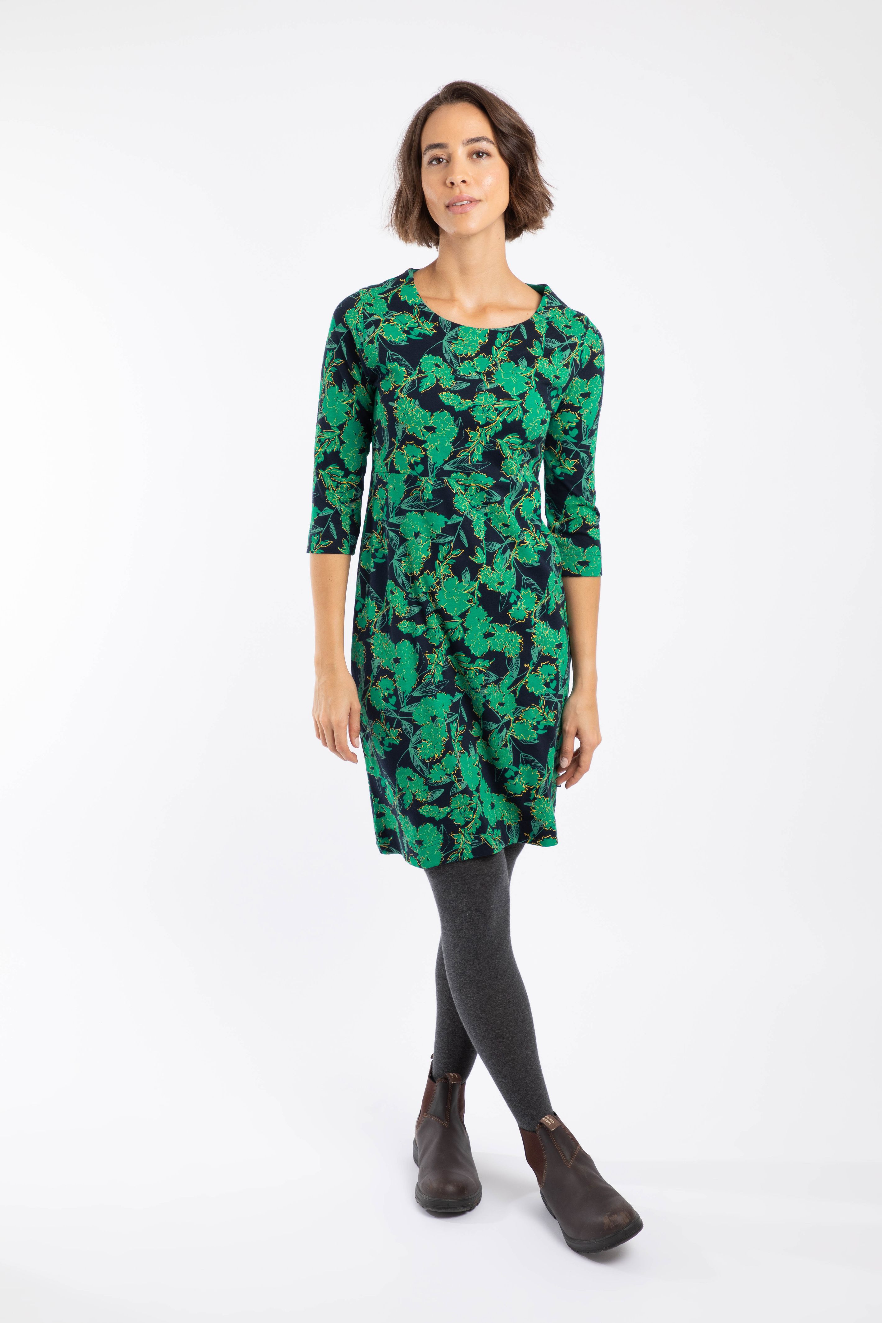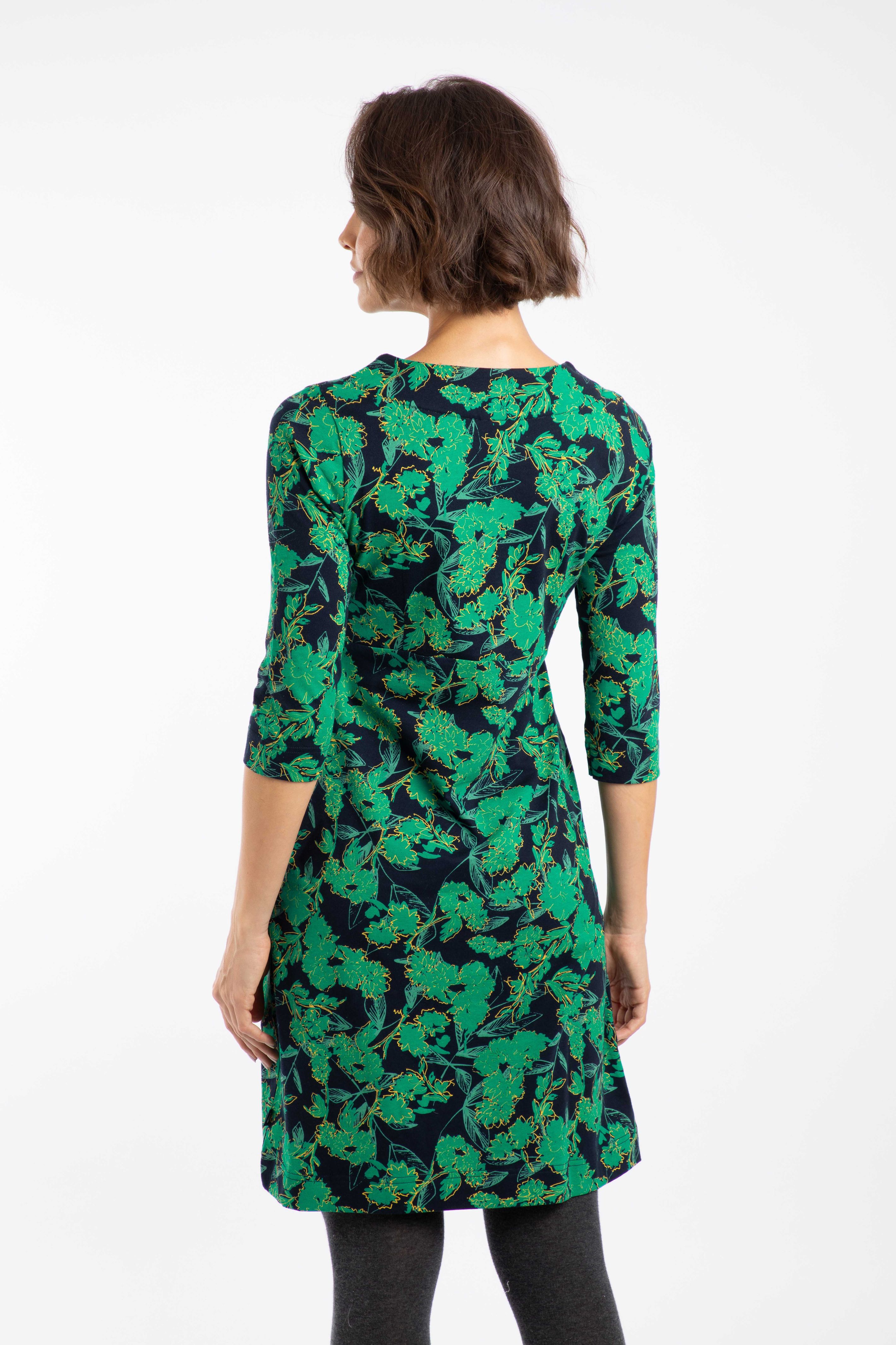 The Shafika Printed Jersey Dress is the easiest outfit you will ever wear. This cotton dress has no fastenings and a little stretch, so you can just pull on and go, for a simple but beautiful outfit. The 3/4 sleeves make it a great choice for more transitional weather, and you can layer it up with tights and a cardigan for cooler weather.