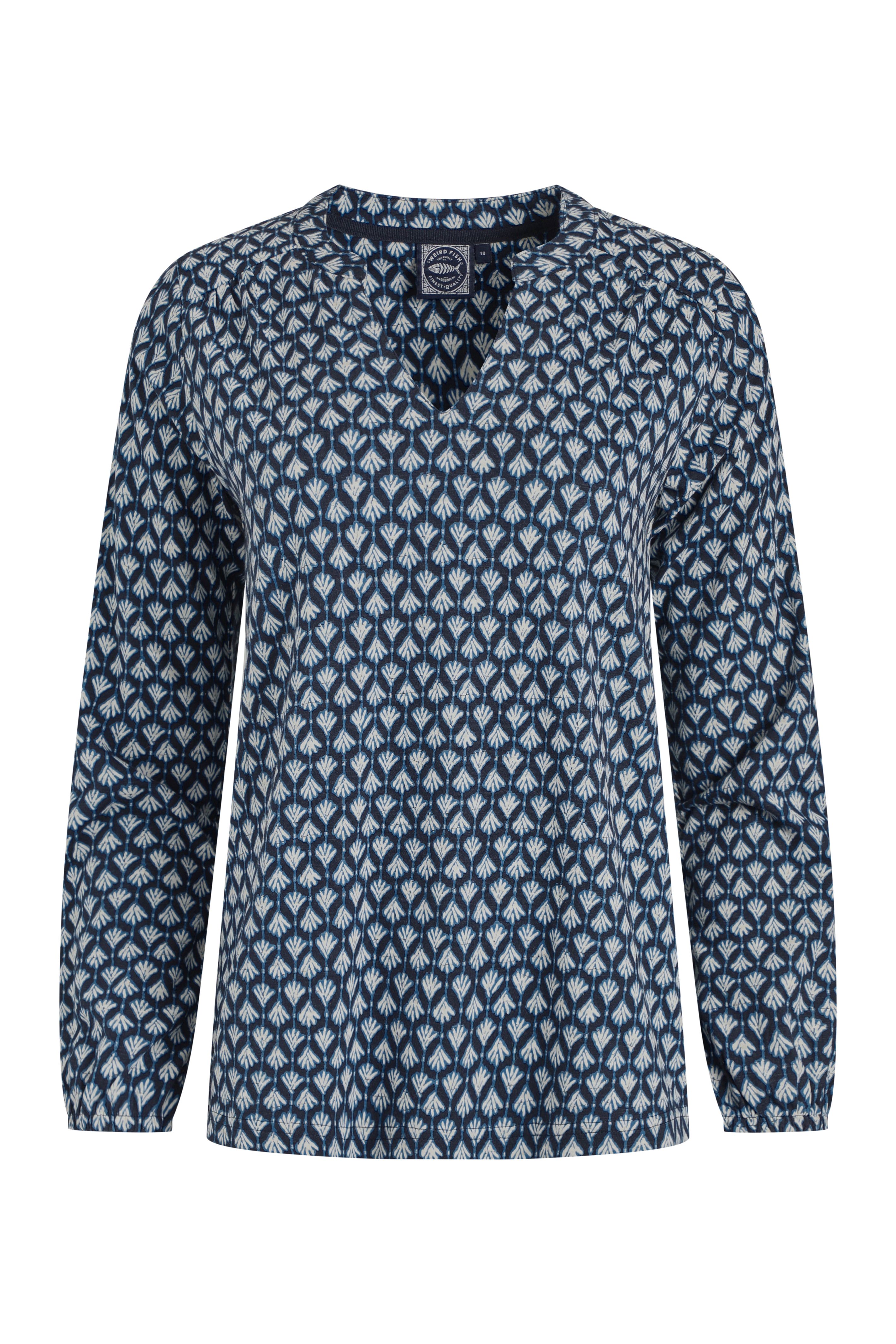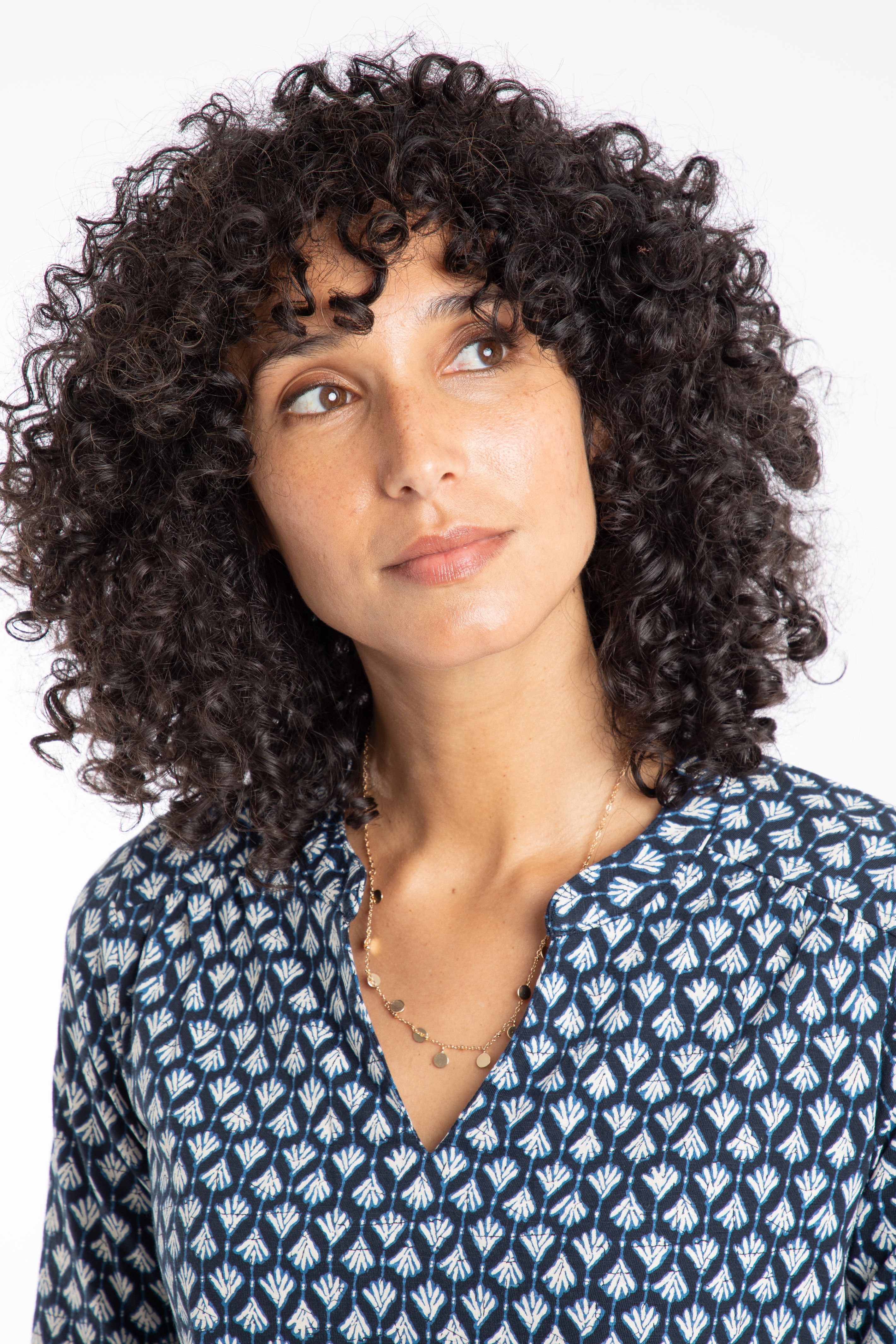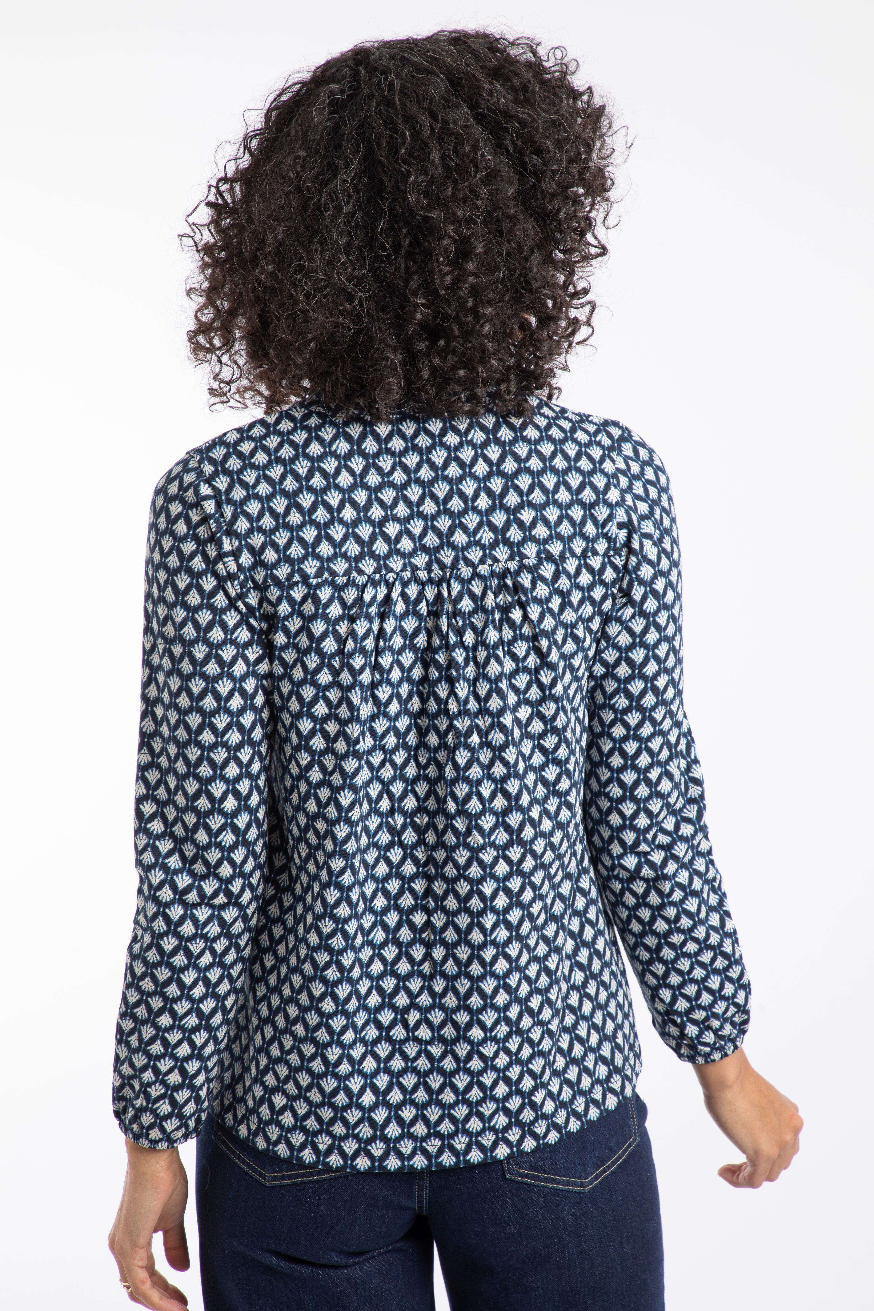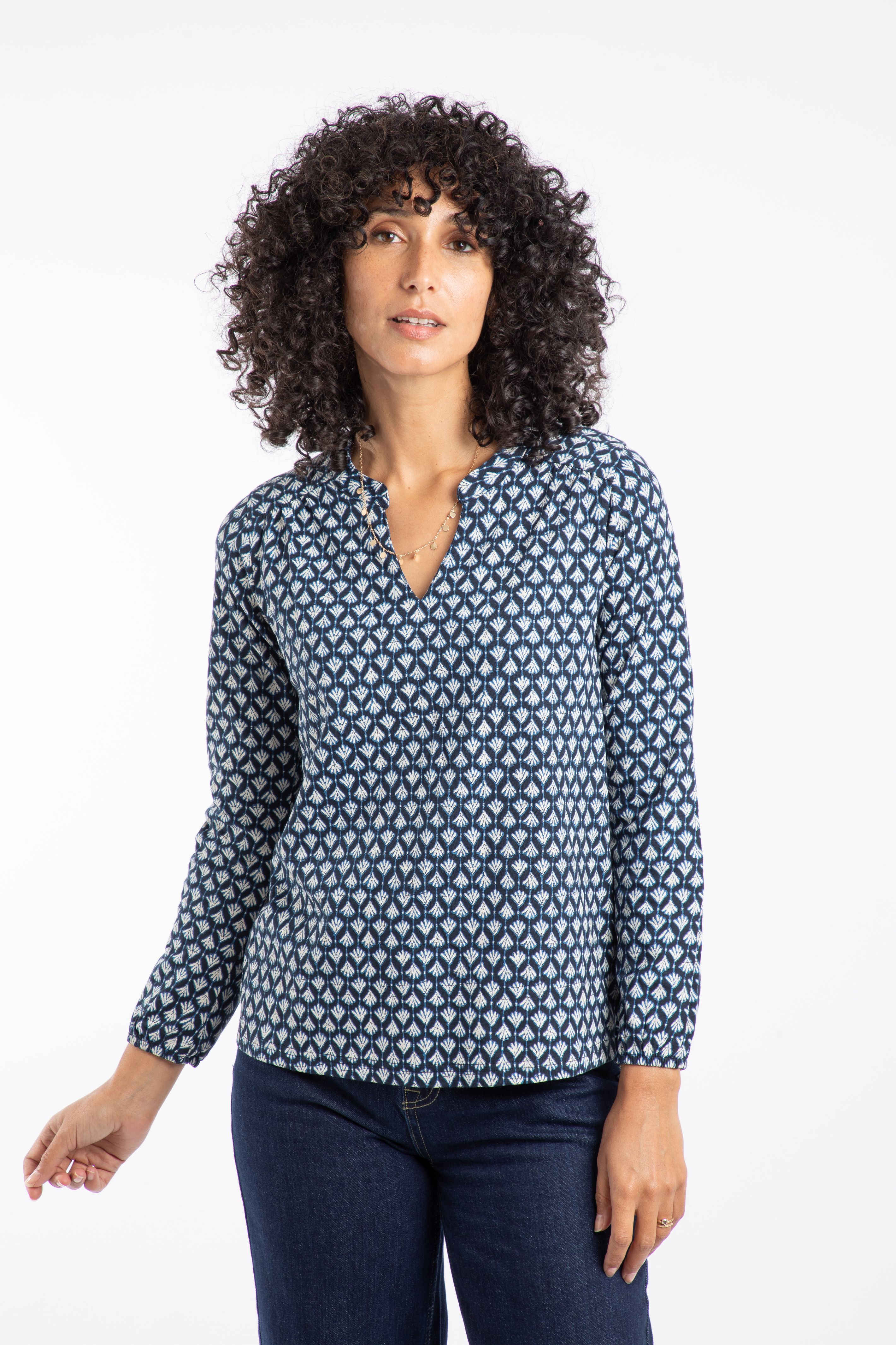 The Brooke,printed jersey top has all the comfort of a T-Shirt with the styling of a blouse. It has a slub texture for a casual feel, but the notched neck and bloused sleeves give this comfy top a smart edge. It looks great styled with our Malorri cargo trousers, or a great pair of jeans.