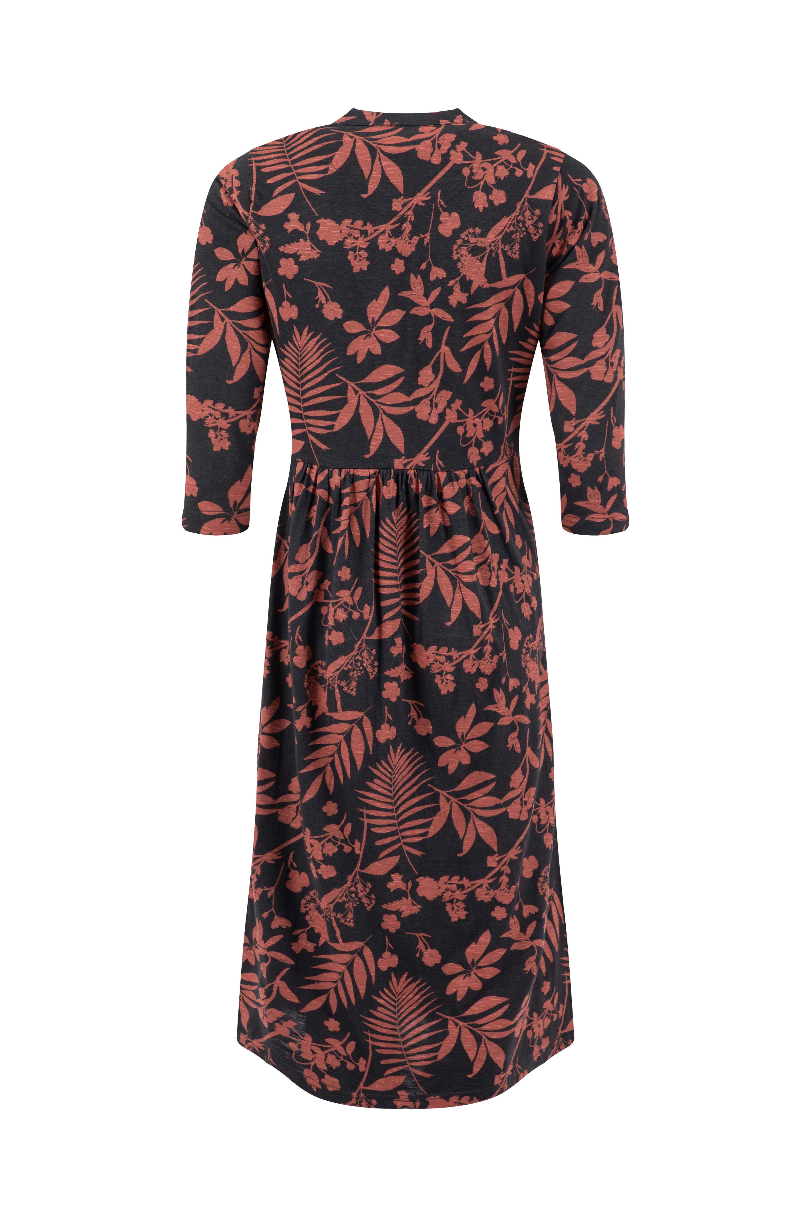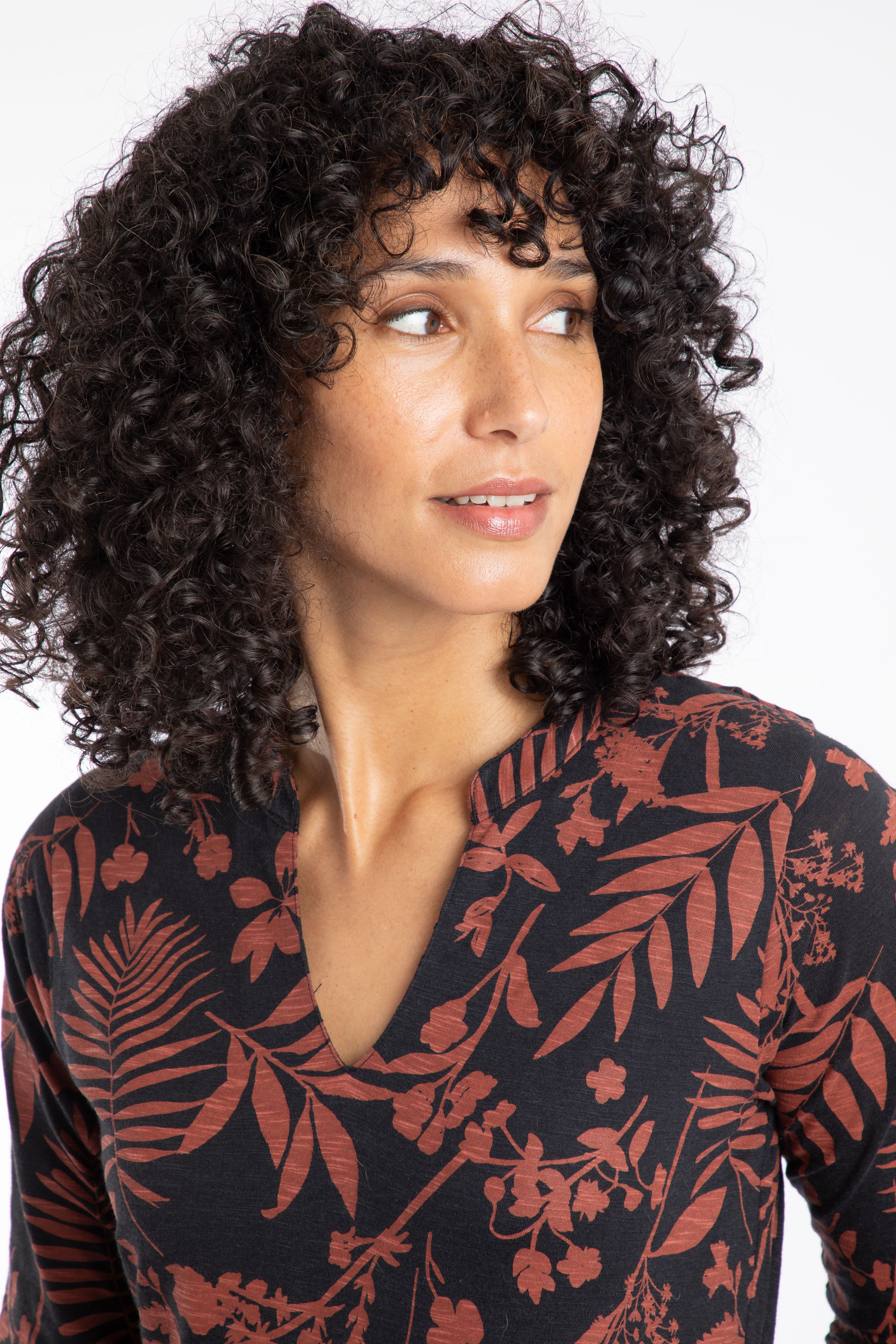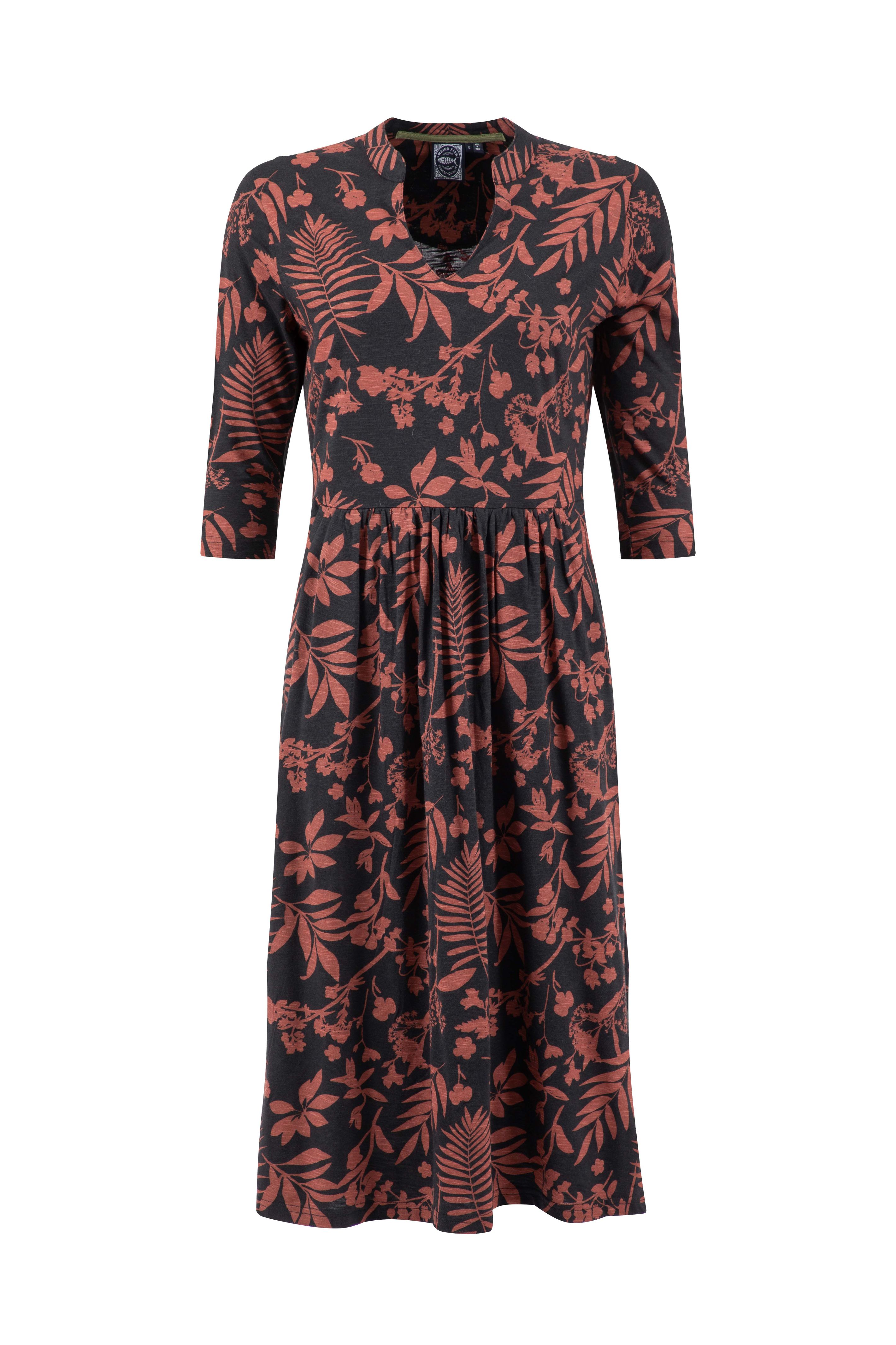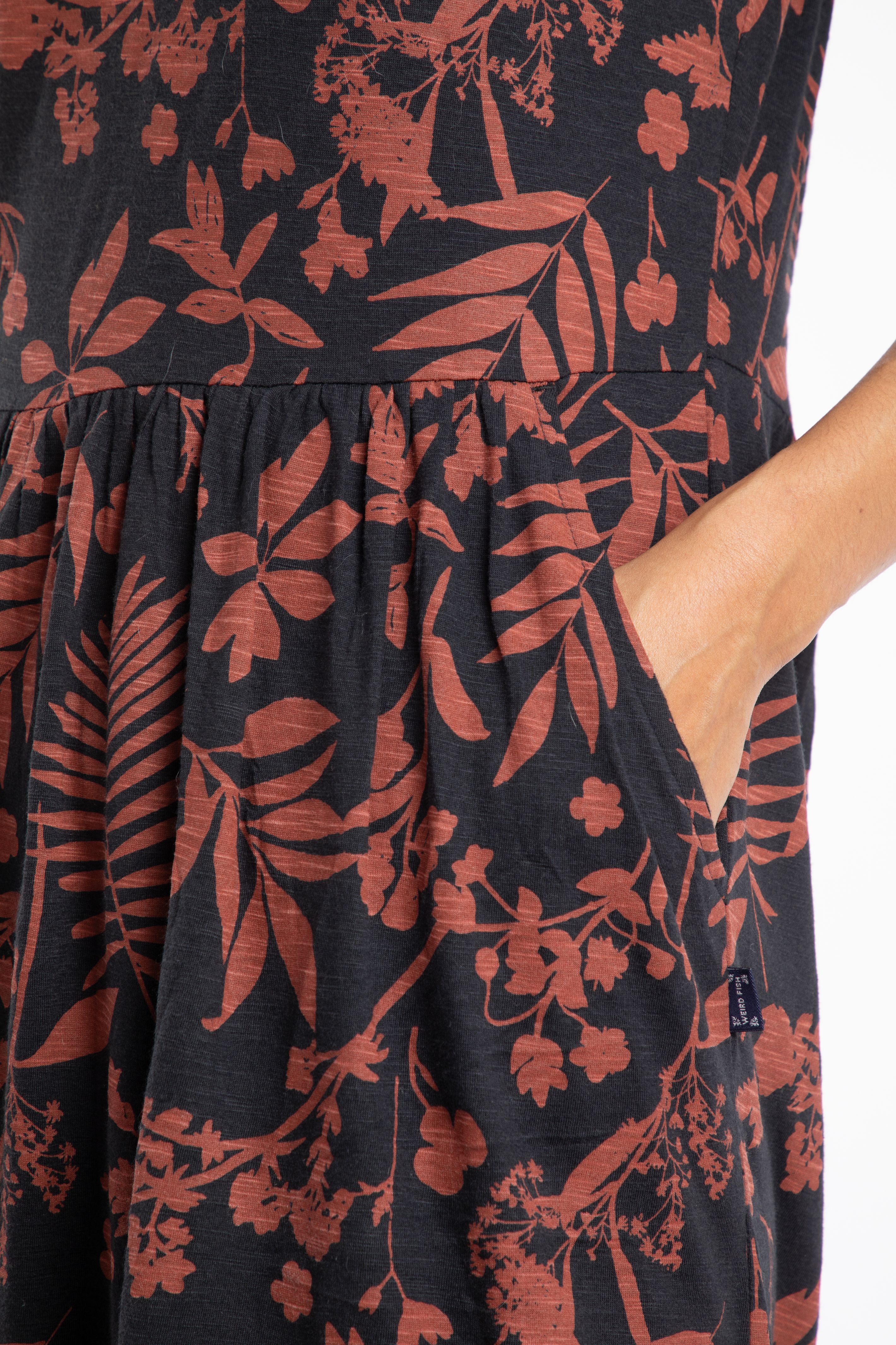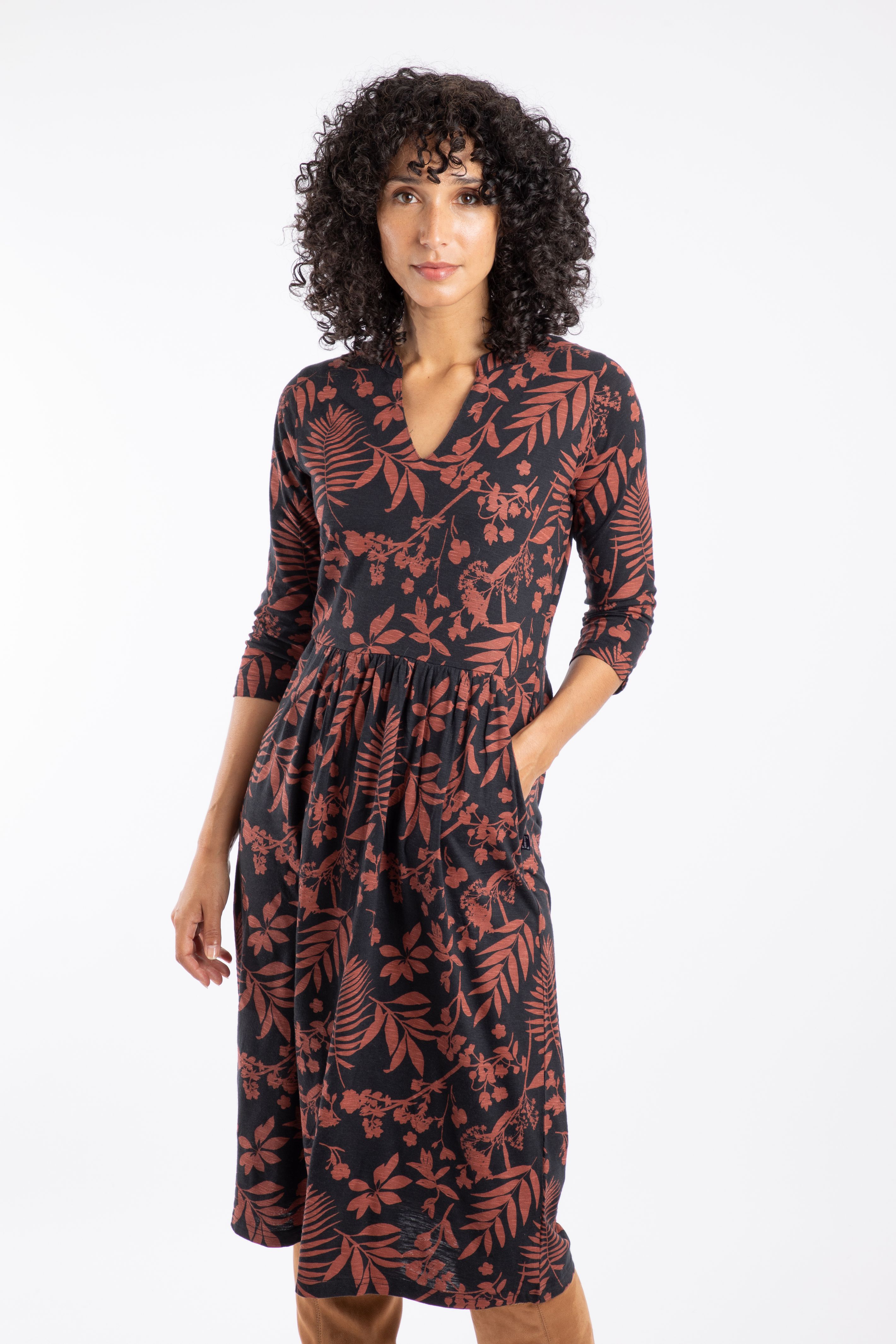 Our Isolde printed jersey midi dress features a gorgeous blend of autumnal colours and is made from a lightweight cotton slub jersey, making it super comfortable. The notched neckline is really flattering, and it even has pockets!
