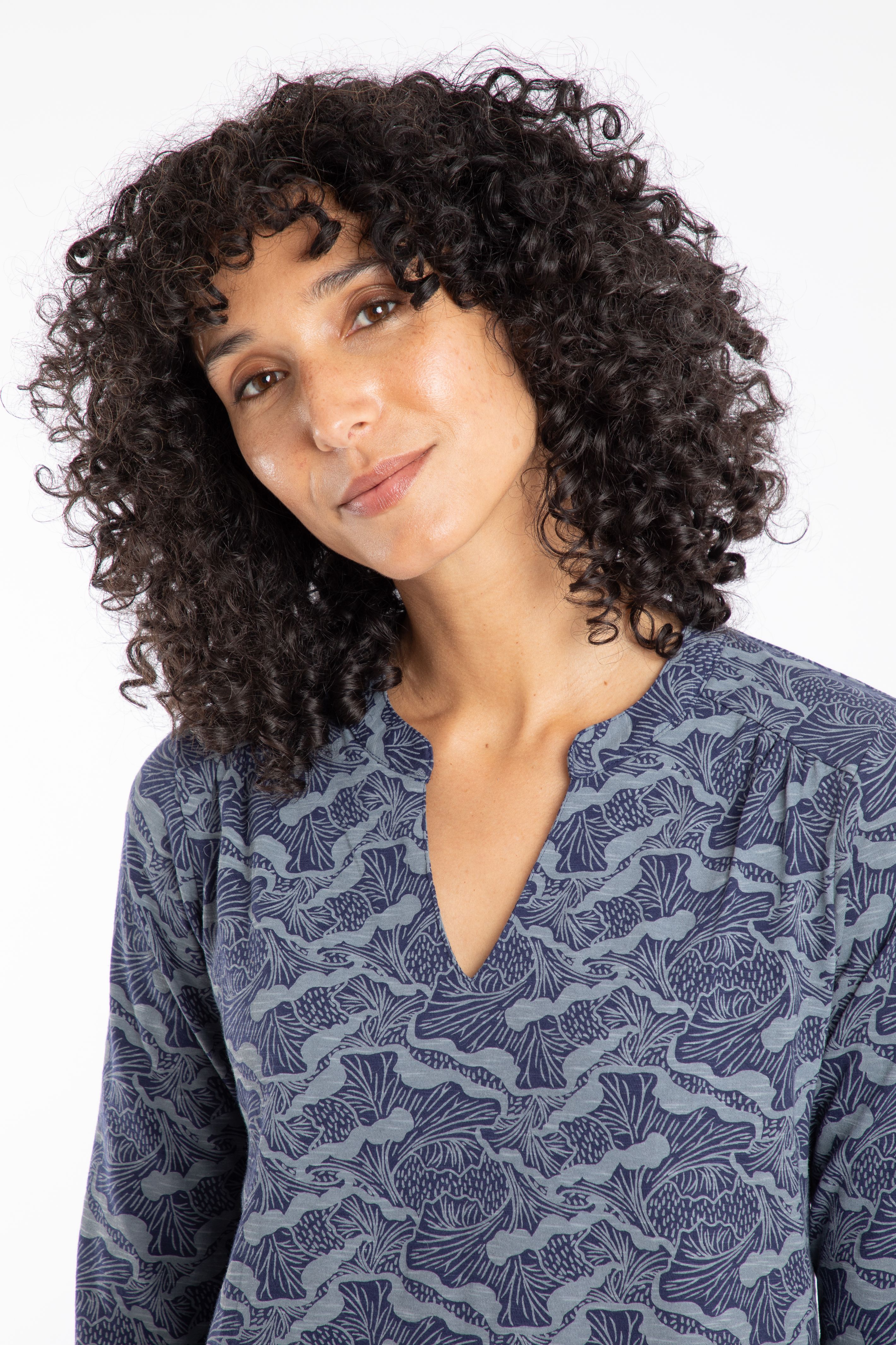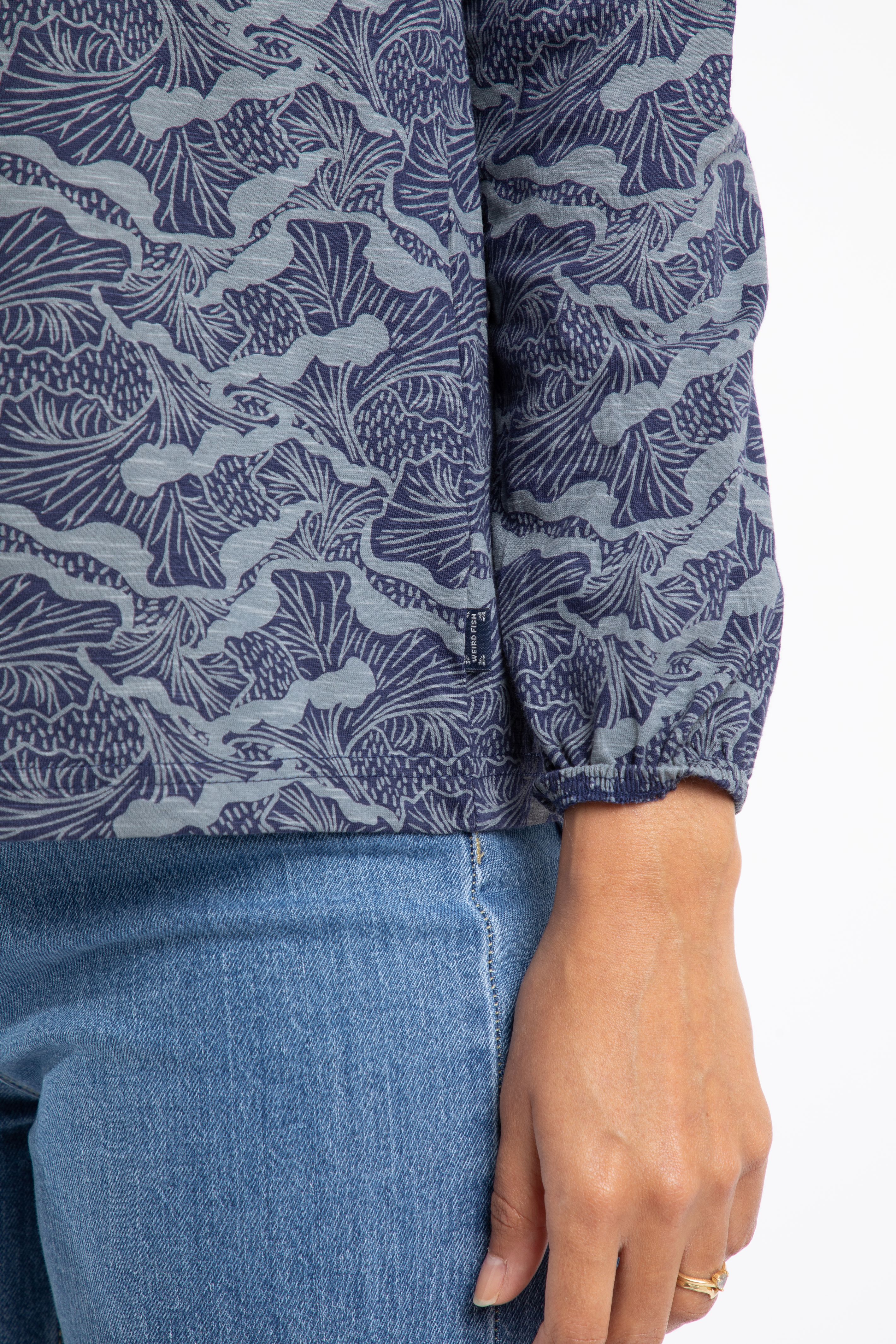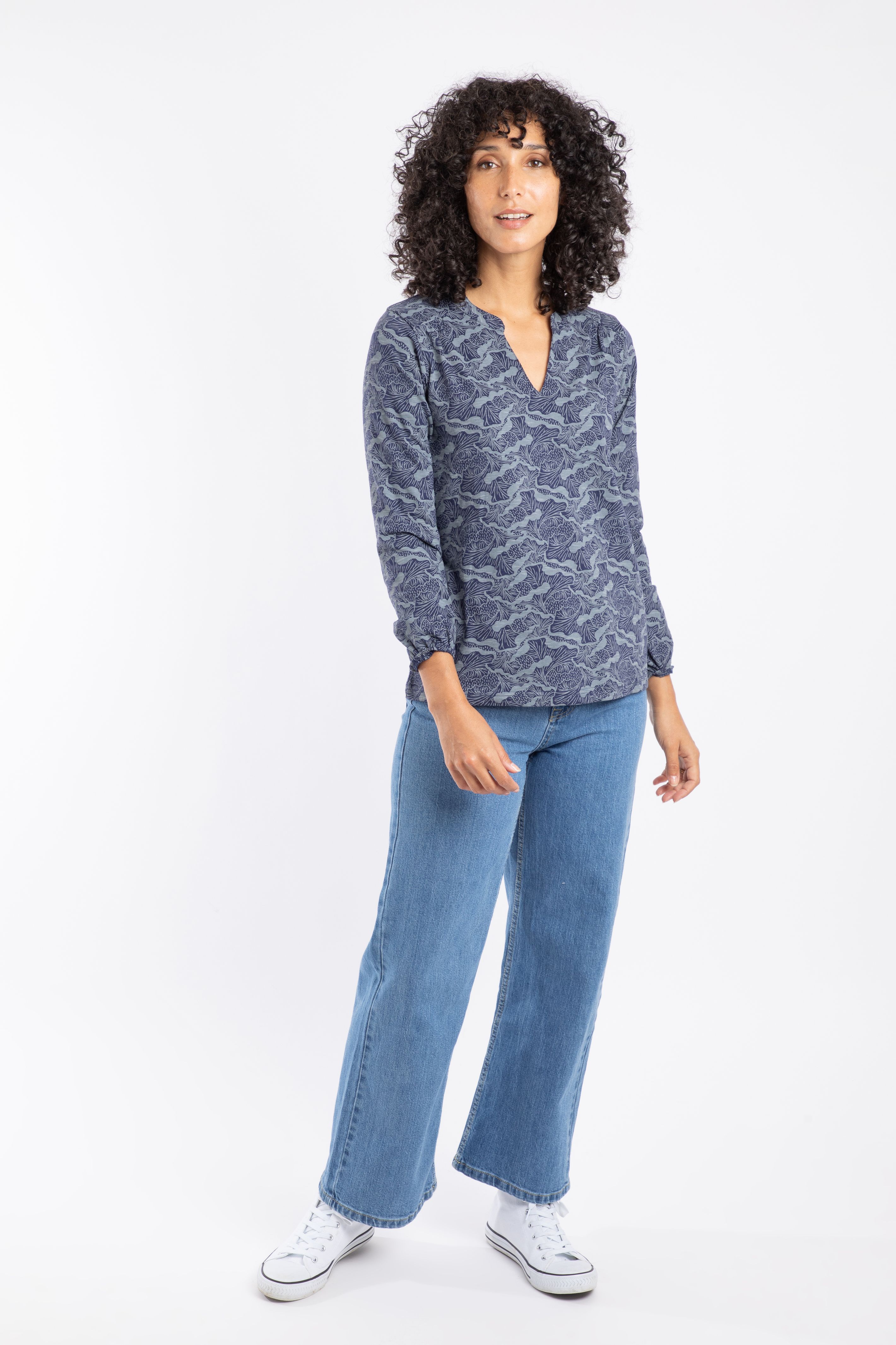 The Brooke,printed jersey top has all the comfort of a T-Shirt with the styling of a blouse. It has a slub texture for a casual feel, but the notched neck and bloused sleeves give this comfy top a smart edge. It looks great styled with our Malorri cargo trousers, or a great pair of jeans.