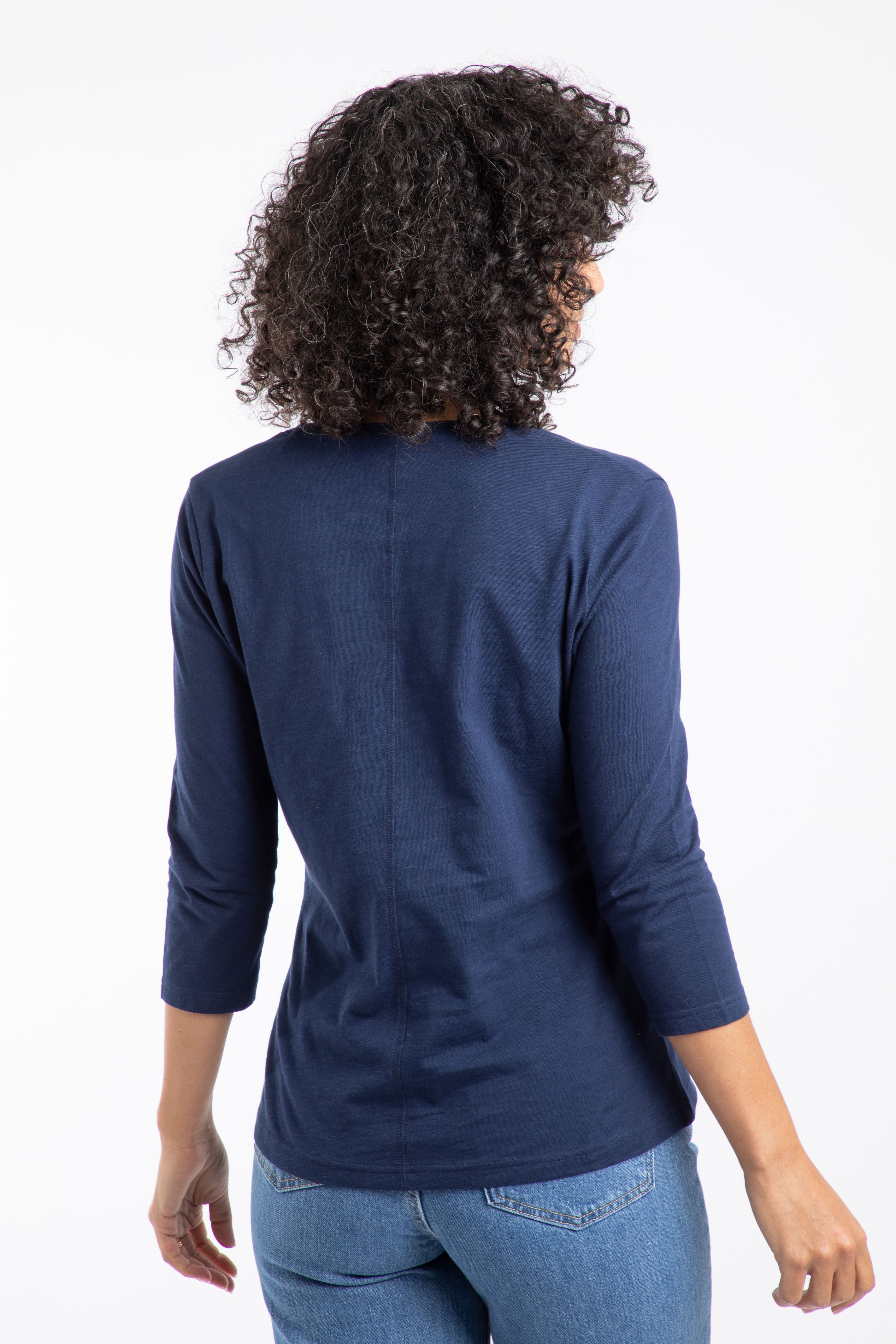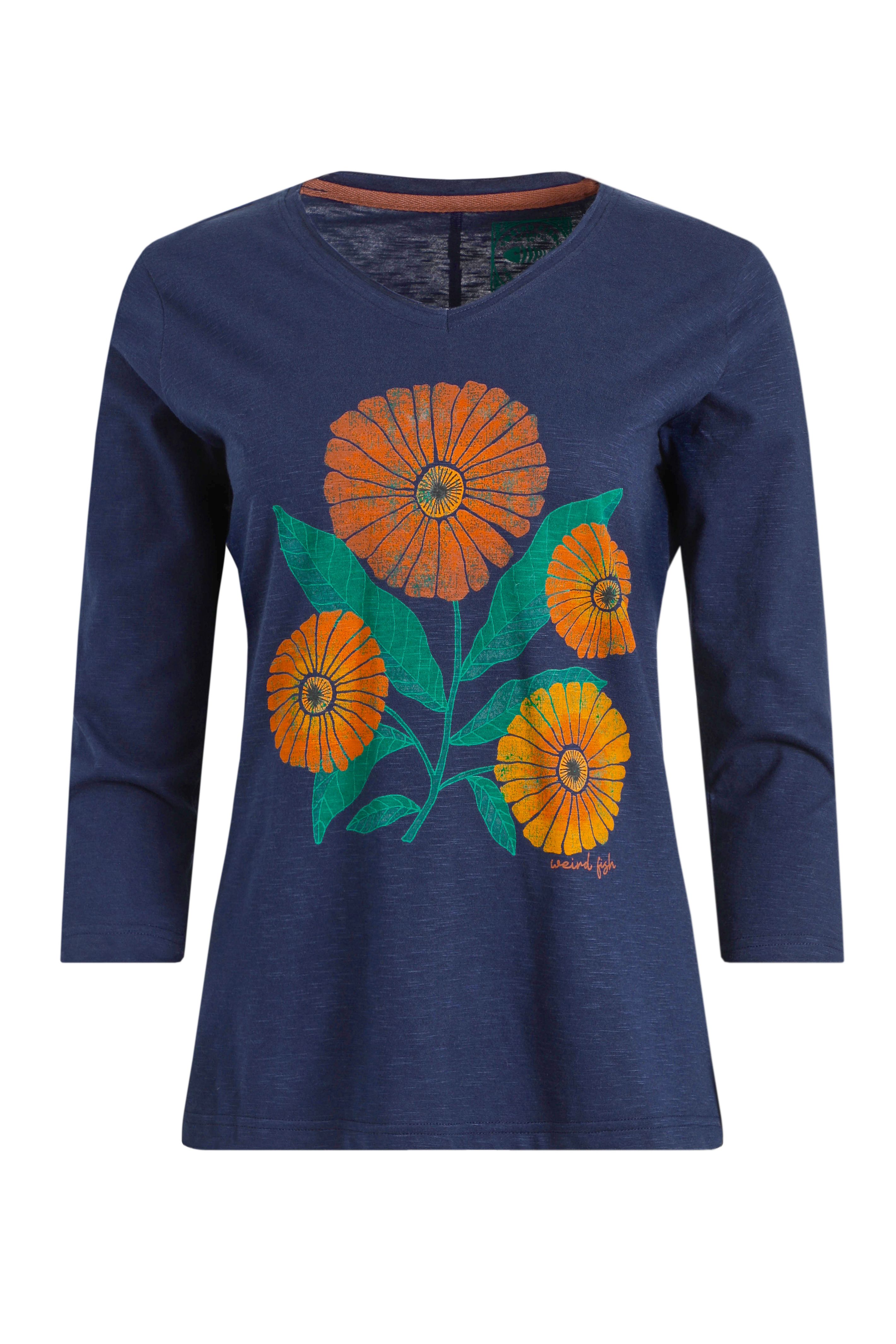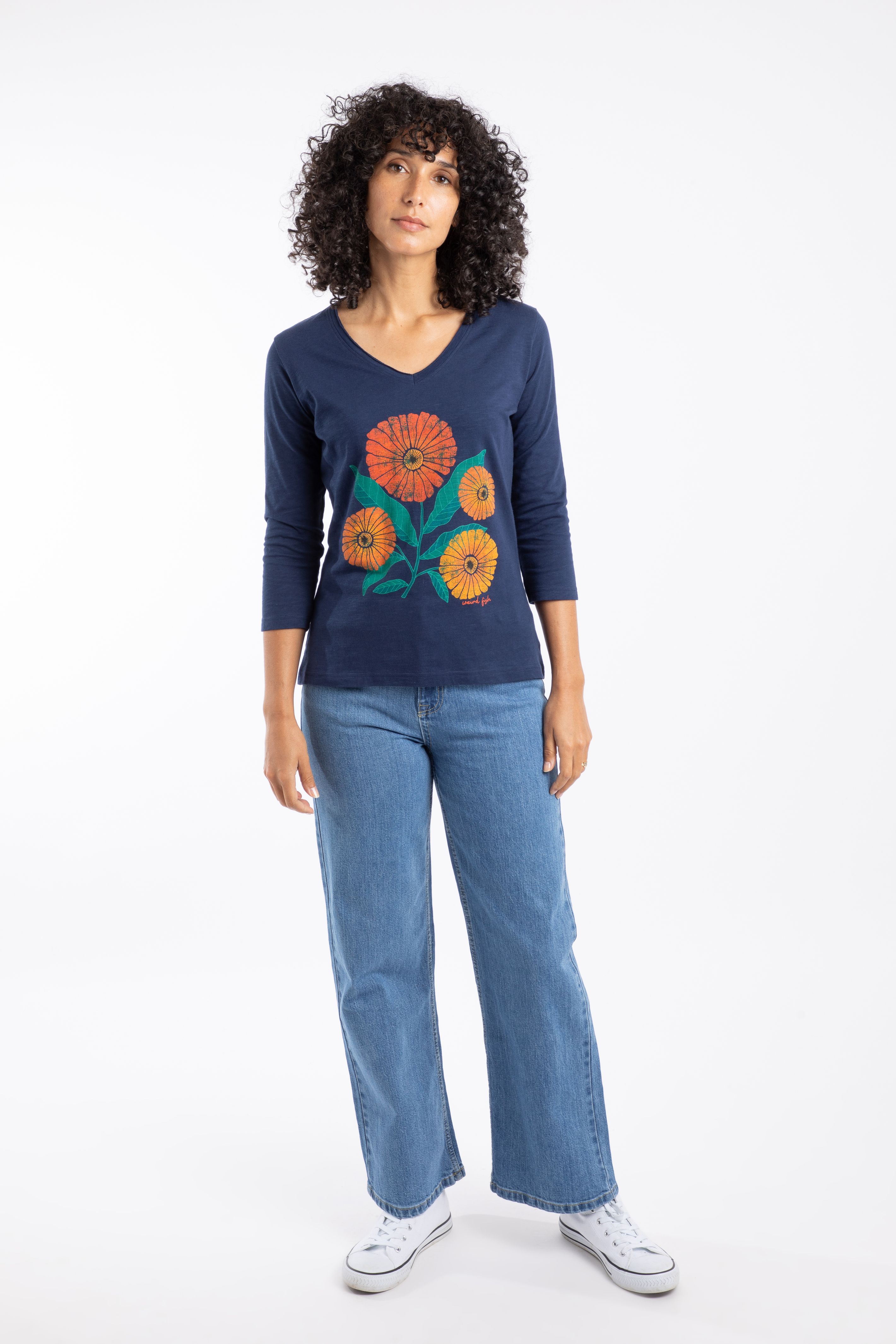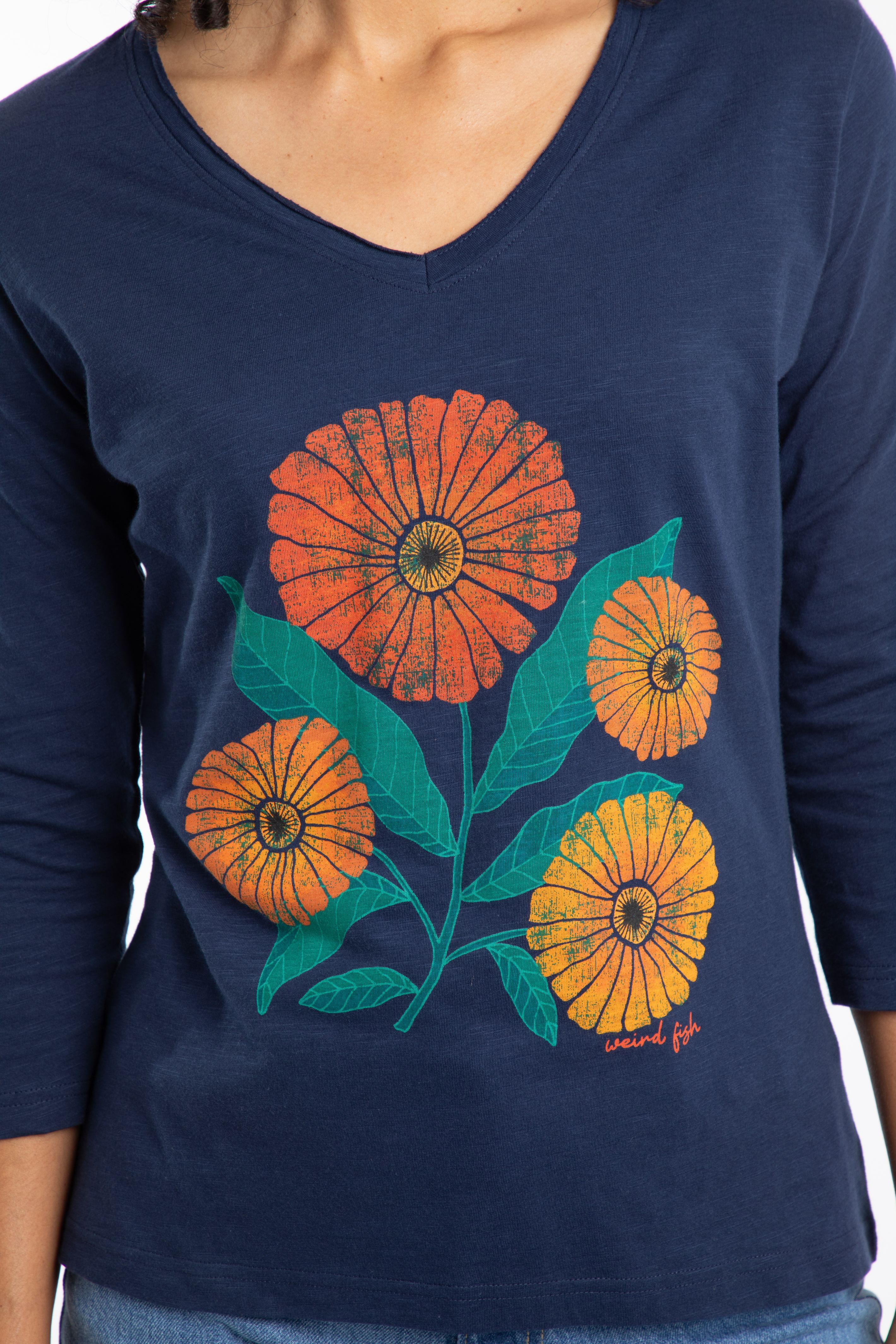 Flower Power Organic Cotton 3/4 Sleeve Graphic T-Shirt Navy
