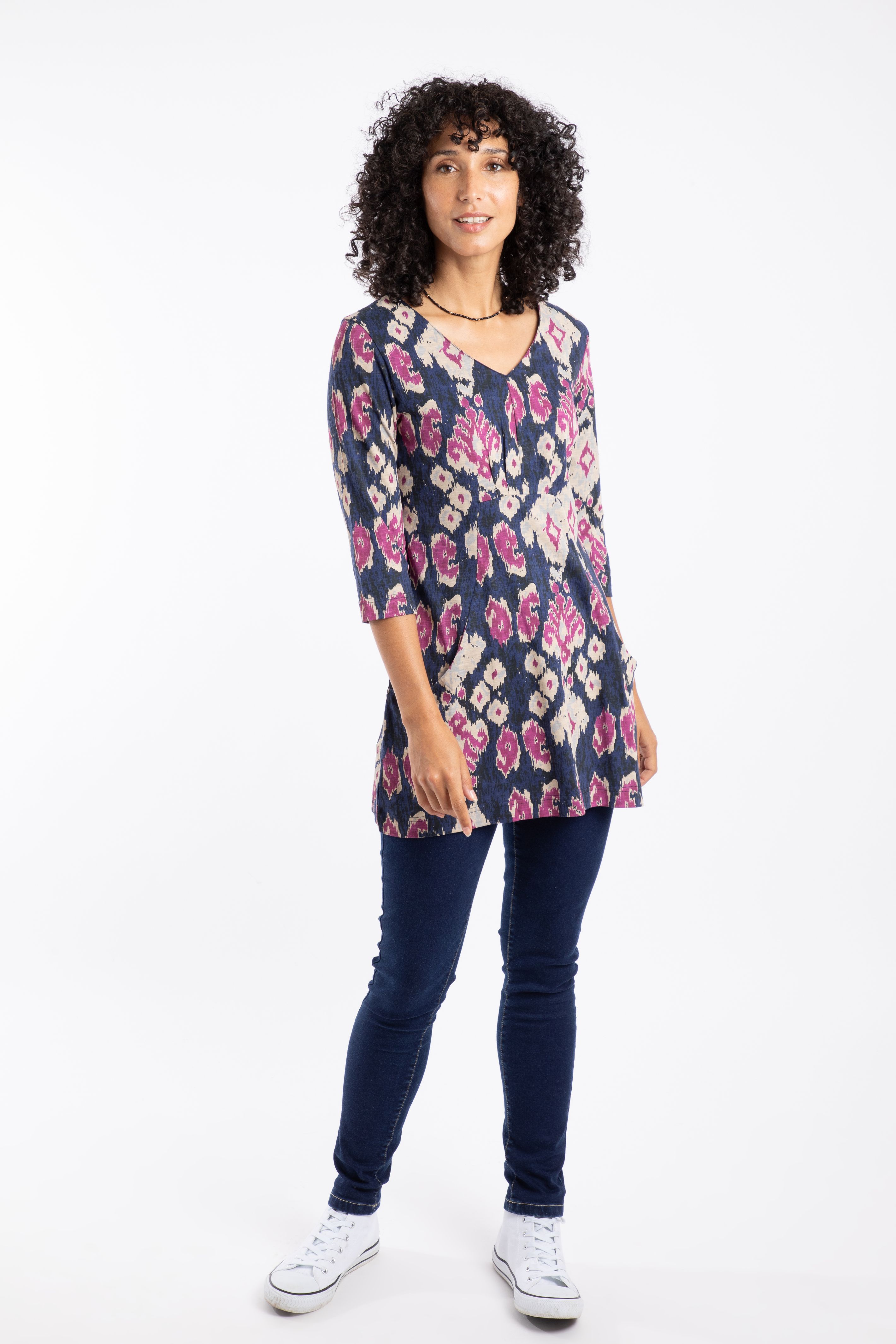Tunics are ideal for this time of year. The Arielle Printed Jersey 3/4 Sleeve Tunic has a flattering V-neckline and 3/4 length sleeves, plus it is darted on the empire line to give a great shape. The eco-friendly fabric mix feels great, plus it's got pockets, and who doesn't love pockets?!